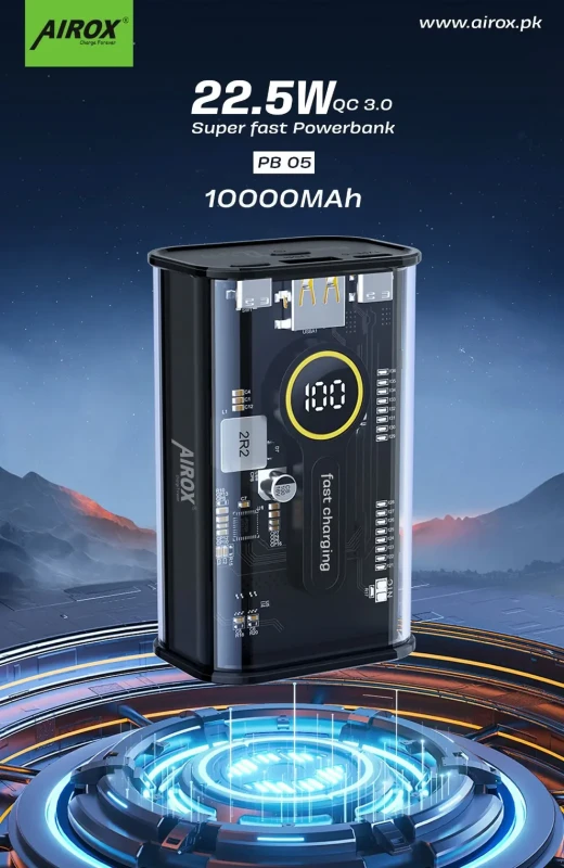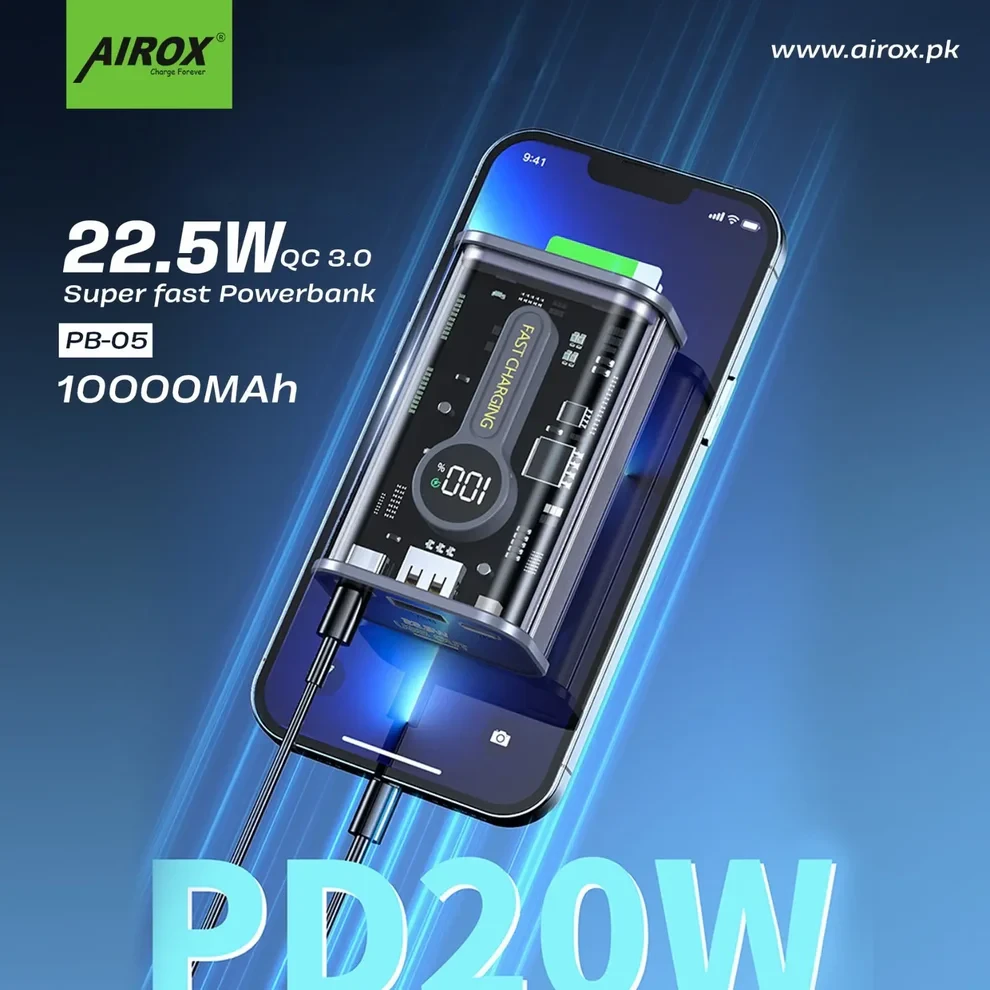 In conclusion, the Airox PB05 Transparent PD Power Bank is a must-have for anyone who values fast and reliable charging. Its 22.5W PD capability, fast USB port, and 1-year warranty make it a standout choice in the world of portable chargers. Stay powered up, stay productive, and stay connected with the Airox PB05.